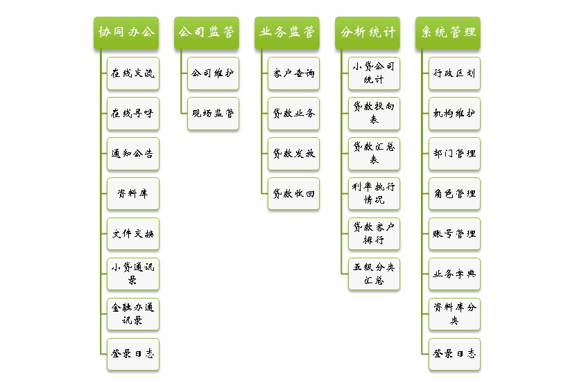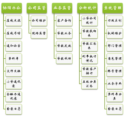 系統(tǒng)主功能模塊包括:協(xié)同辦公、公司監(jiān)管、業(yè)務(wù)監(jiān)管、分析統(tǒng)計、系統(tǒng)管理等,各子功能模塊見下圖: